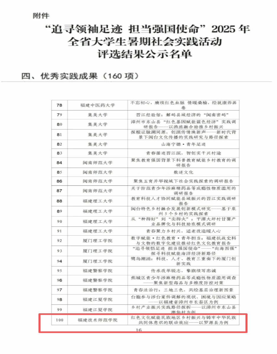 近日,福建省教育厅正式公布“追寻领袖足迹 担当强国使命”2025年全省大学生暑期社会实践活动的评选结果。我院团委副书记陈婉璇老师指导“赓续红色血脉,践行绿色发展”实践队撰写的调研报告——《红色文化赋能民族地区乡村振兴与铸牢中华民族共同体意识的联动效应——以罗源县为例》获评全省“优秀实践成果”。