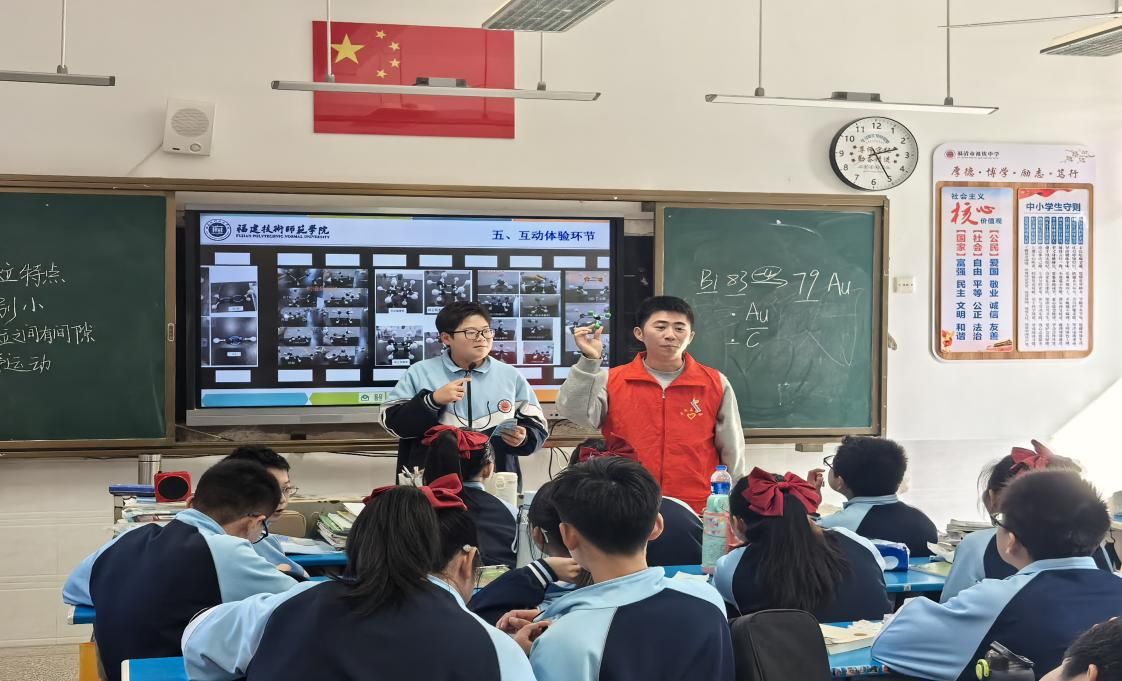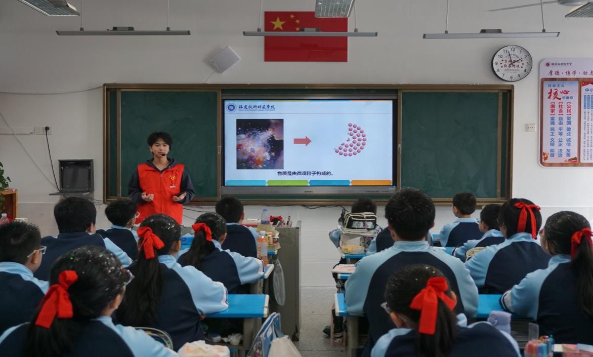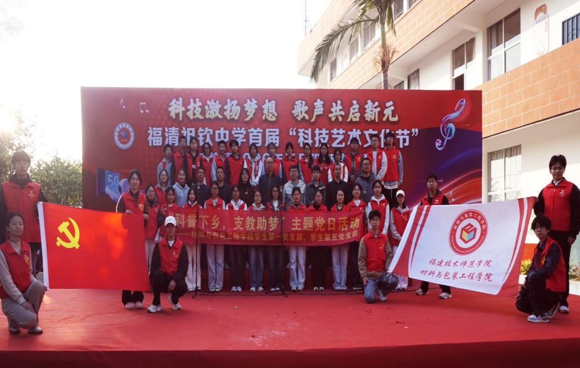 12月30日,由东瀚镇党委、政府、东瀚镇新时代文明实践所主办,莲峰村村“两委”、莲峰村乡贤促进会、福清市祖钦中学承办,福建技术师范学院材料与包装工程学院协办的科技艺术文化节活动,在福清市东瀚镇祖钦中学顺利开展。我院学生第一、第五党支部组织全体党员赴福清祖钦中学,开展“科普下乡、支教助梦”主题党日活动。