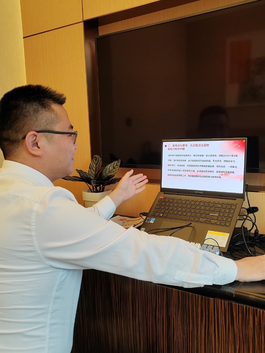 会上,学院全体师生党员集体学习了习近平总书记在学习贯彻习近平新时代中国特色社会主义思想主题教育工作会议上的重要讲话精神。校党委组织部副部长林伟传达了校党委开展主题教育有关工作部署,并就学院开展主题教育进行了部署。他指出,学院师生党员要统一思想认识,进一步提高政治站位,增强学习贯彻习近平新时代中国特色社会主义思想的思想自觉政治自觉行动自觉,把“学思想、强党性、重实践、建新功”总要求贯穿主题教育全过程,努力在以学铸魂、以学增智、以学正风、以学促干方面取得实实在在的成绩,以服务学校事业发展的成效来检验主题教育成果。