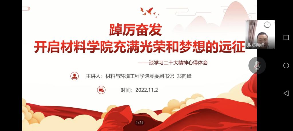11月2日下午,我院党委副书记郑向峰以“踔厉奋发,开启材料学院充满光荣和梦想的远征”为题,讲授党的二十大专题党课。我院全体教职工、学生党员和入党积极分子参加此次大会,会议采用线上方式进行。
