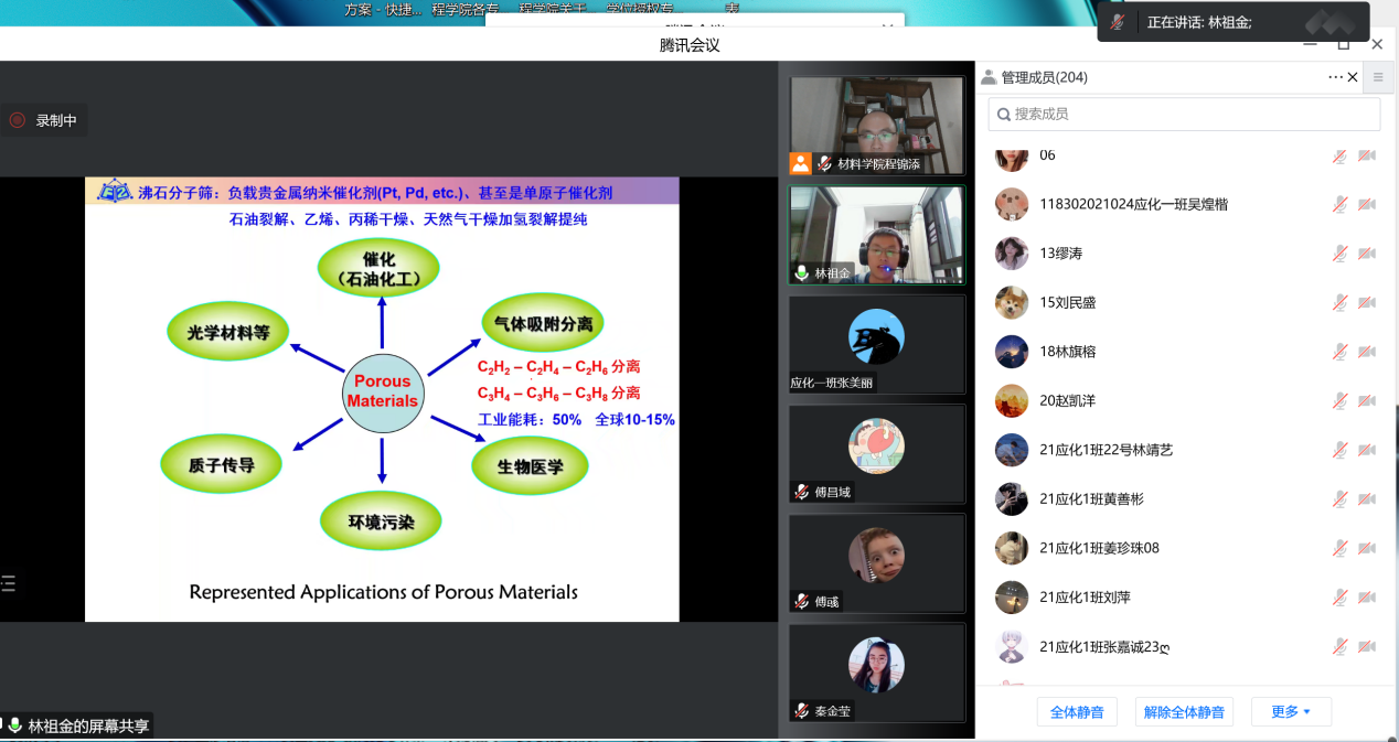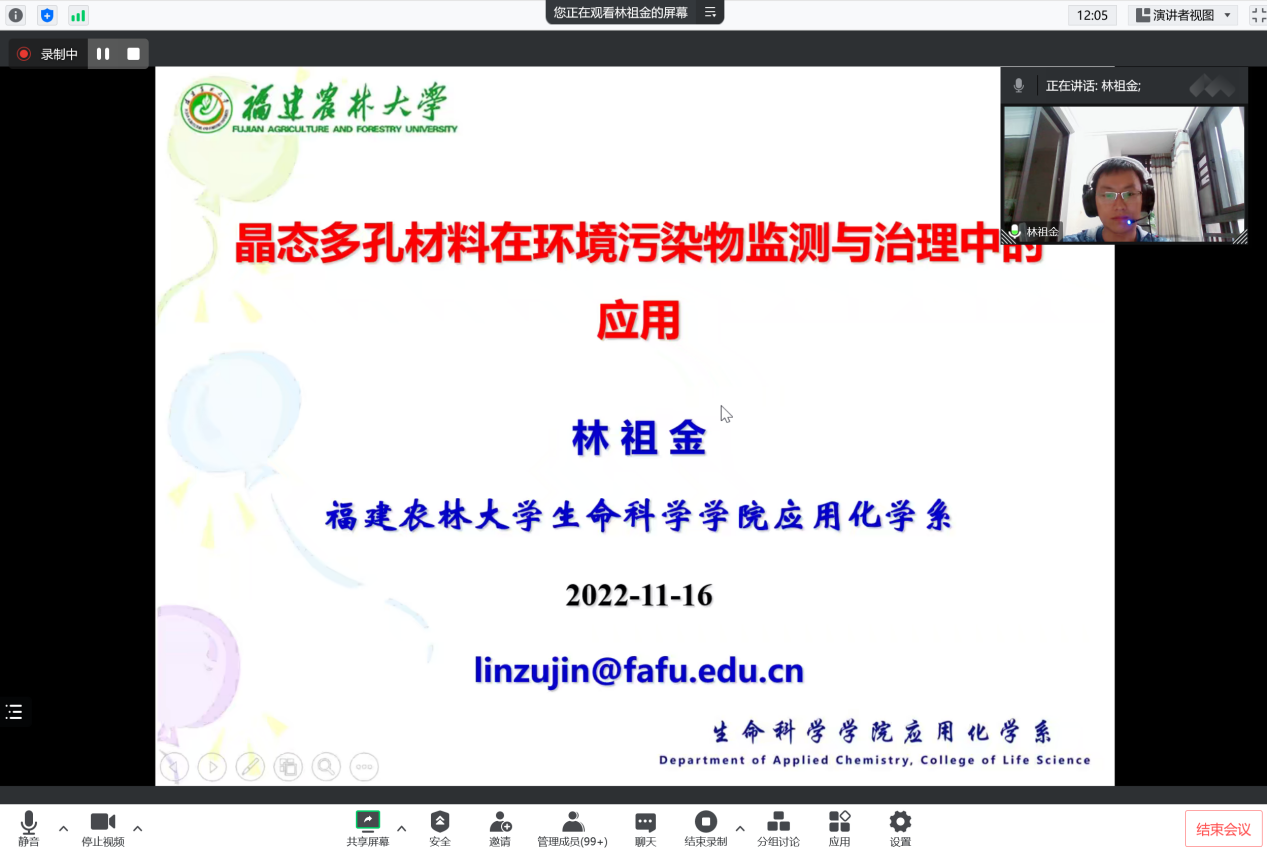 林祖金教授从最基础化学知识出发,就晶态多孔材料(包括MOFs、COFs和HOFs)的发展、设计与应用等问题作了深入浅出的介绍,重点分享了其研究小组围绕MOFs/HOFs和环境污染物监测与治理两个主题而开展的应用研究,并与师生深入交流。