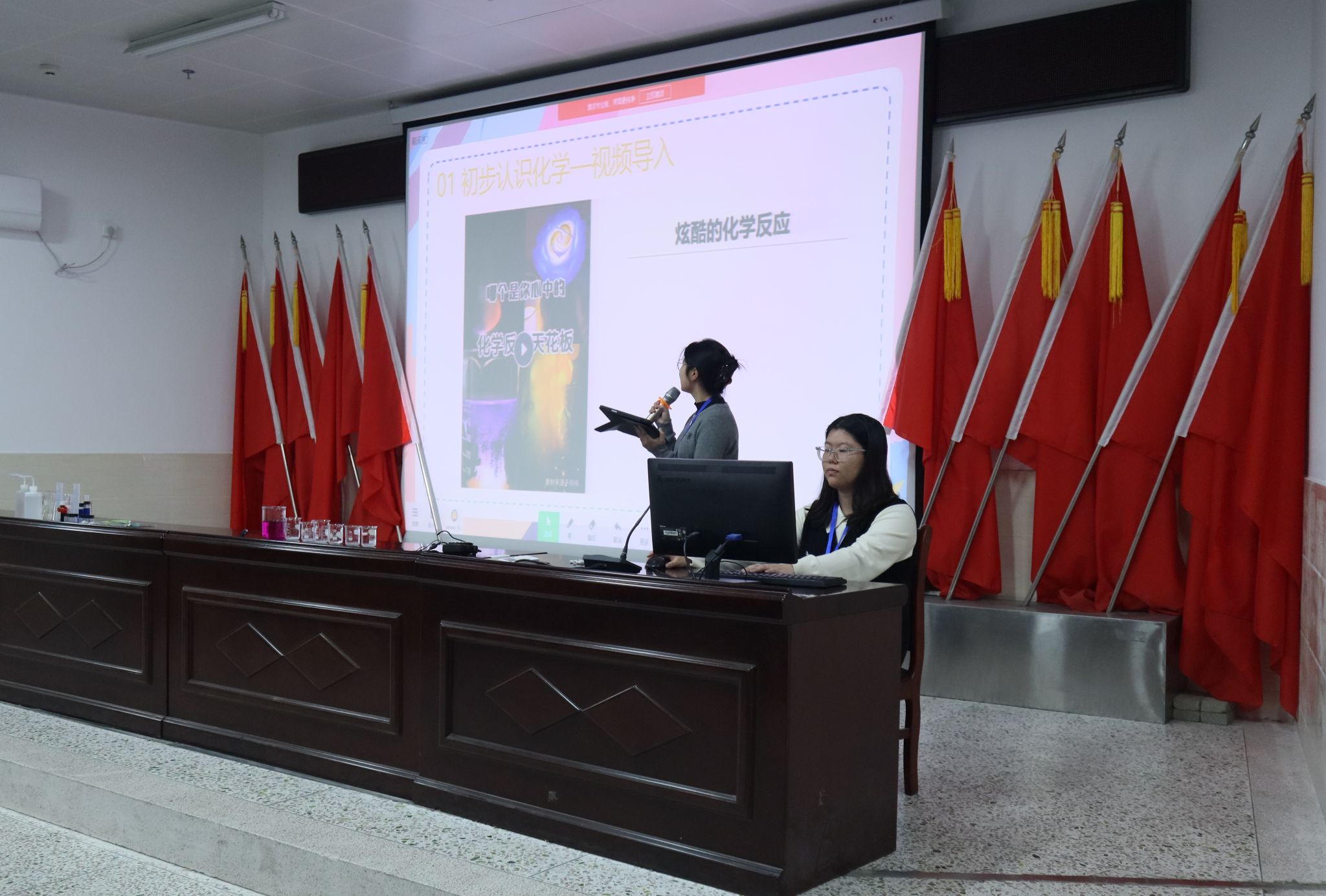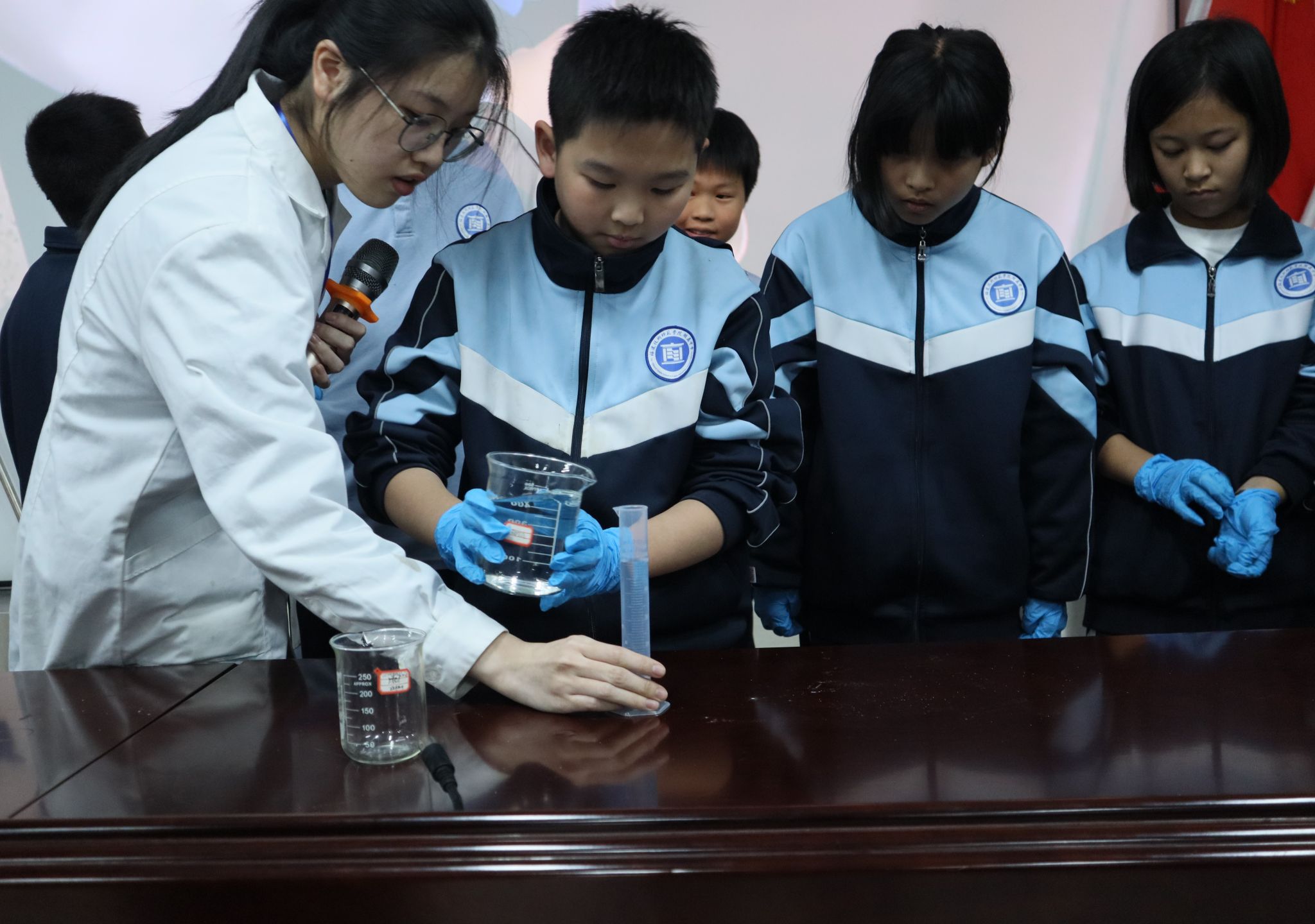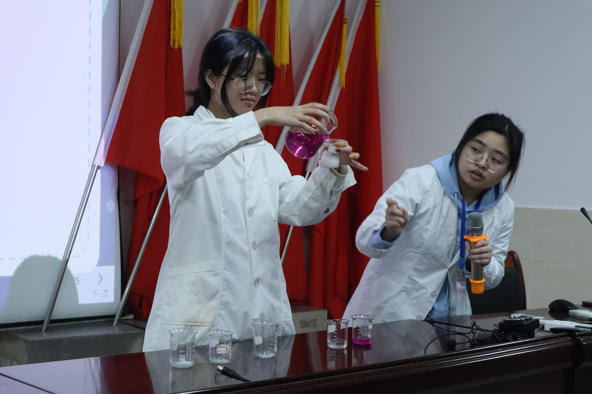 随后,实习教师们通过演示实验和体验活动,让学生们亲身感受化学变化的魅力。他们通俗易懂地讲解了实验原理,耐心的为学生们解答疑问,并邀请部分学生上台参与体验简单的化学实验,探索化学的奥秘。