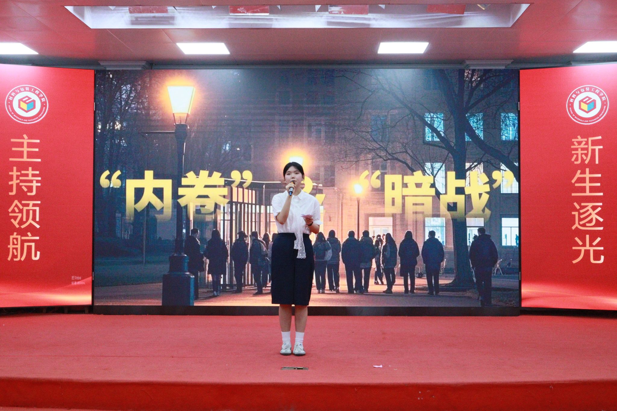 经过层层选拔,脱颖而出的9位选手同台竞技,为观众带来了一场视听盛宴。决赛分为“模拟主持”和“即兴主持”两个环节。在“模拟主持”环节中,选手们聚焦 “女性健康”、“传统文化传承”、“内卷现象思辨”、“人工智能发展” 等大学生关注的热点问题,以兼具深度与温度的视角,展现了新时代青年对社会现实的思考与担当。“即兴主持”环节中,选手们随机抽取社会热点话题进行解读,用流畅的语言和清晰的逻辑展开阐述。选手们的精彩表现赢得台下观众的阵阵掌声,现场气氛热烈。
