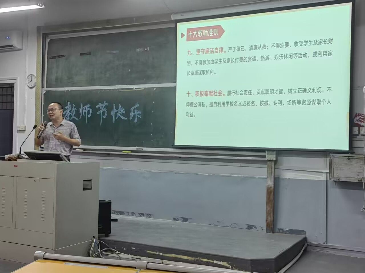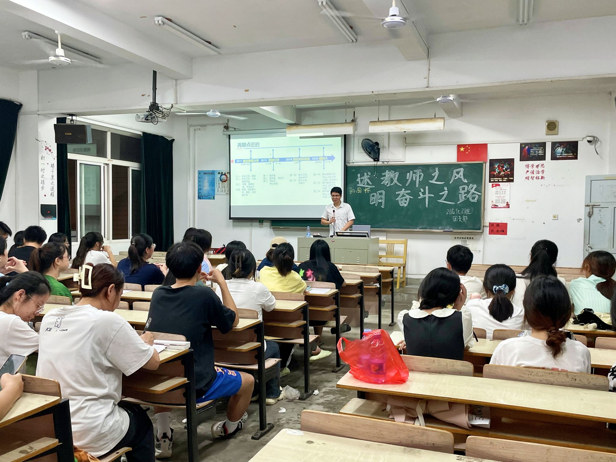 2021级全体学生在课后通过“献一句祝福”、“送一盆绿植”、“奉一杯茶水”等丰富多彩的形式表达了对老师的敬爱之情;2021级应用化学(师范)1班与2022级应用化学(师范)专业的学生结合师范专业特色,联合举办了以“赓续师范初心,勇担育人使命”为主题的团日活动,教师代表林辉和林玉雕受邀出席,同学们借助深情的诗歌朗诵抒发了感激之情;2021级应用化学(师范)2班的学生围绕“述教师之风,明奋斗之路”主题开展座谈会,学校新进教师代表孙国栋与同学们在共同观看“感动中国人物——张桂梅”的有关视频后,结合自身经历,在继续求学深造、考公、考研等方面给同学们带来了一场别开生面的职业生涯规划课。