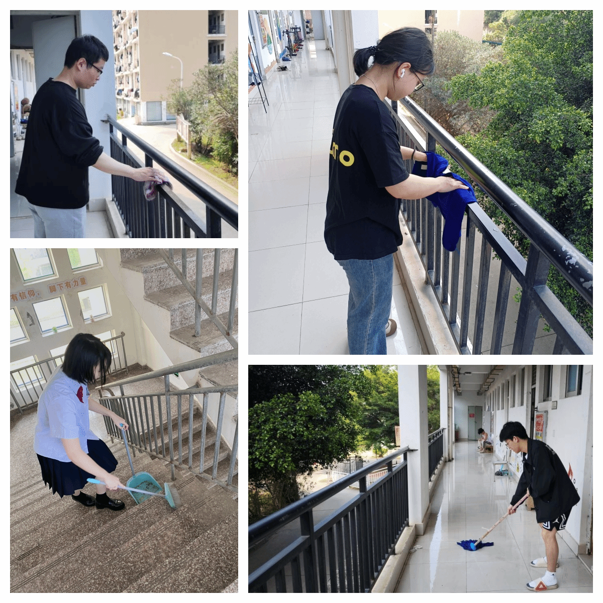 学习活动结束后,青年党员、团员分成若干组,在校园内,手持扫把、拖把和垃圾袋,互相配合,捡烟头、扫地、擦窗、整理公共区域,热火朝天地投入到劳动中去。