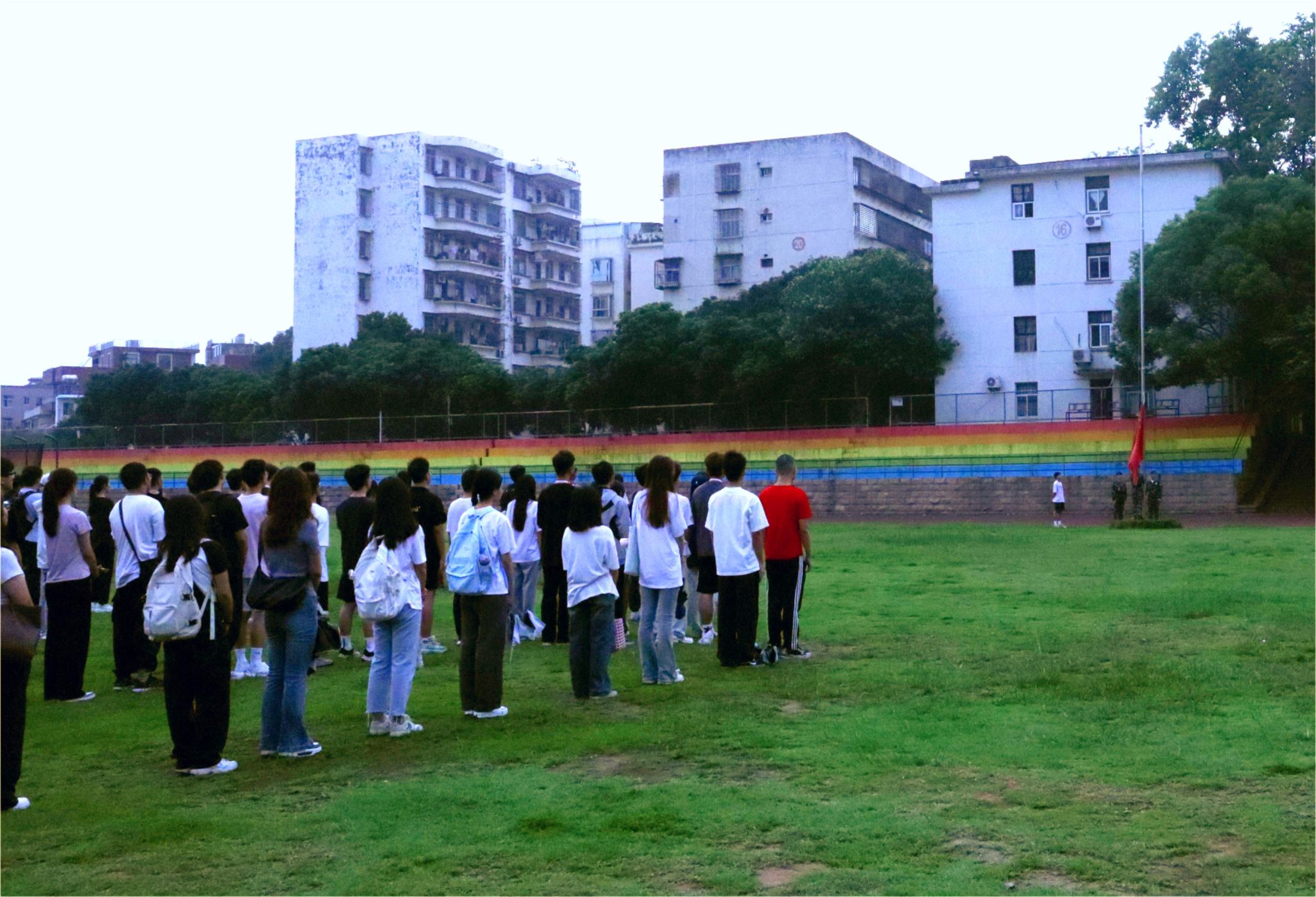 伴随着激昂的《义勇军进行曲》,在全体师生的注目礼下,五星红旗冉冉升起,在晨光中迎风飘扬。