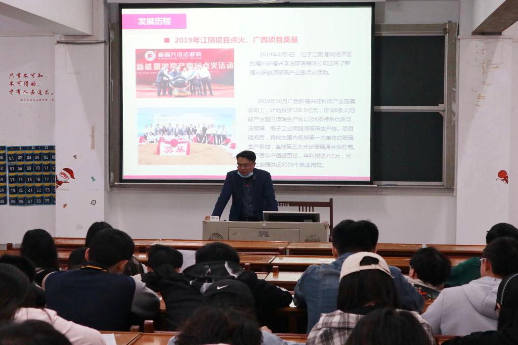 会上,新福兴玻璃工业集团有限公司张振强从集团的组织构架、区位条件、发展历程、企业文化、人才需求等方面对集团展开介绍。张总监提出企业所需的人才类型,包括技术系和事务系型人才,并解答了同学们最关注的福利待遇问题。会议期间,张总监结合自身经历,言传身教、幽默风趣的给同学们上了一堂生动的职业生涯规划课程,并与同学们积极互动,将整个会场气氛推向高潮。