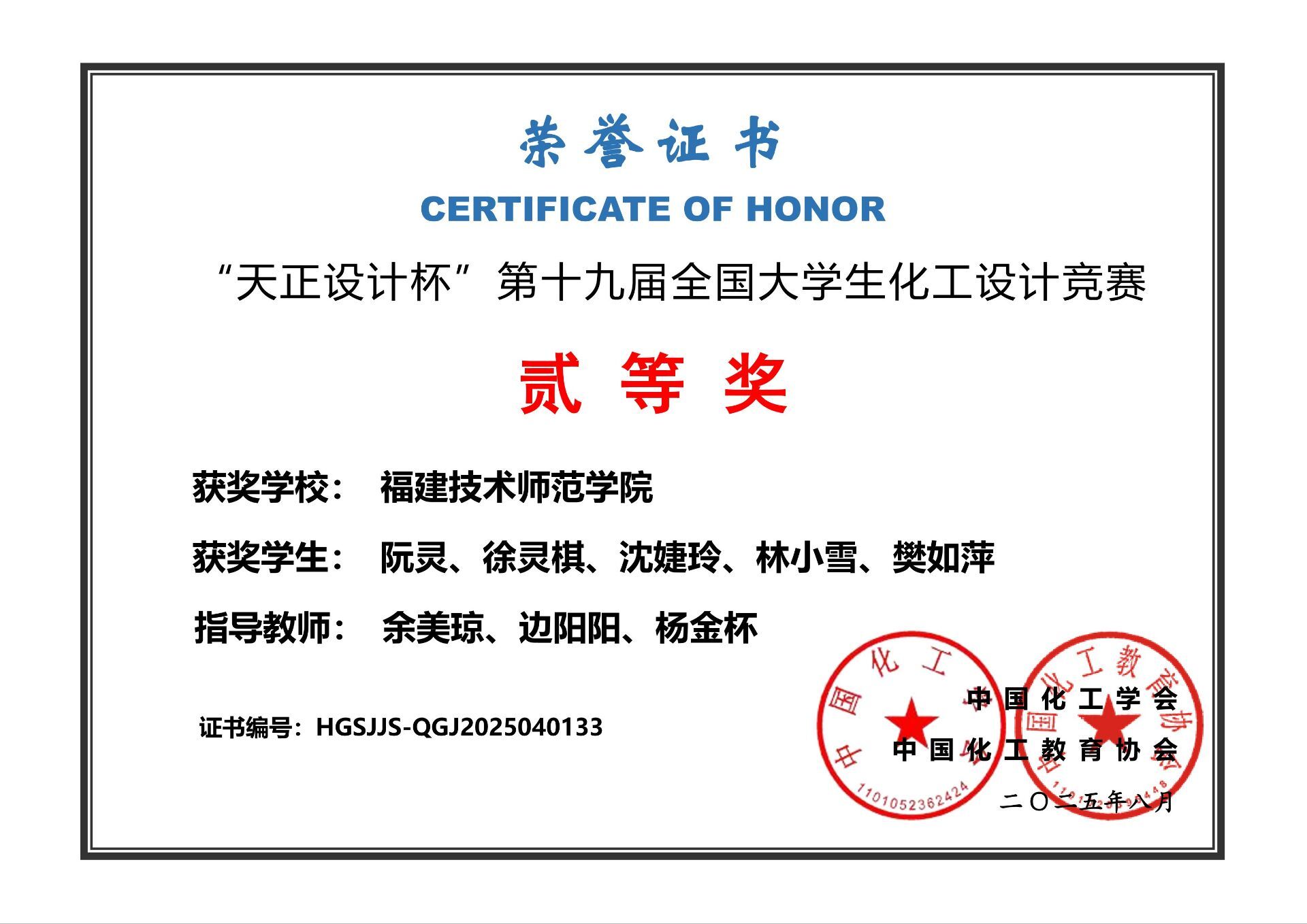 7月30日至8月1日,由中国化工学会、中国化工教育协会主办,吉首大学承办的2025年华南地区大学生化工设计大赛暨“天正设计杯”第十九届全国大学生化工设计竞赛华南赛区赛在吉首大学成功举办。经过3天激烈角逐,我院2022级应用化学(师范)专业学生阮灵、徐灵棋、沈婕玲、林小雪、樊如萍组成的“能文能5队”斩获国赛二等奖1项。