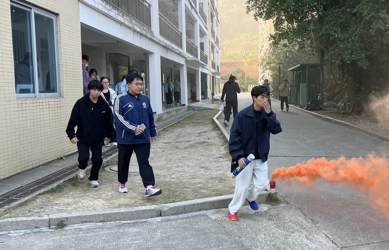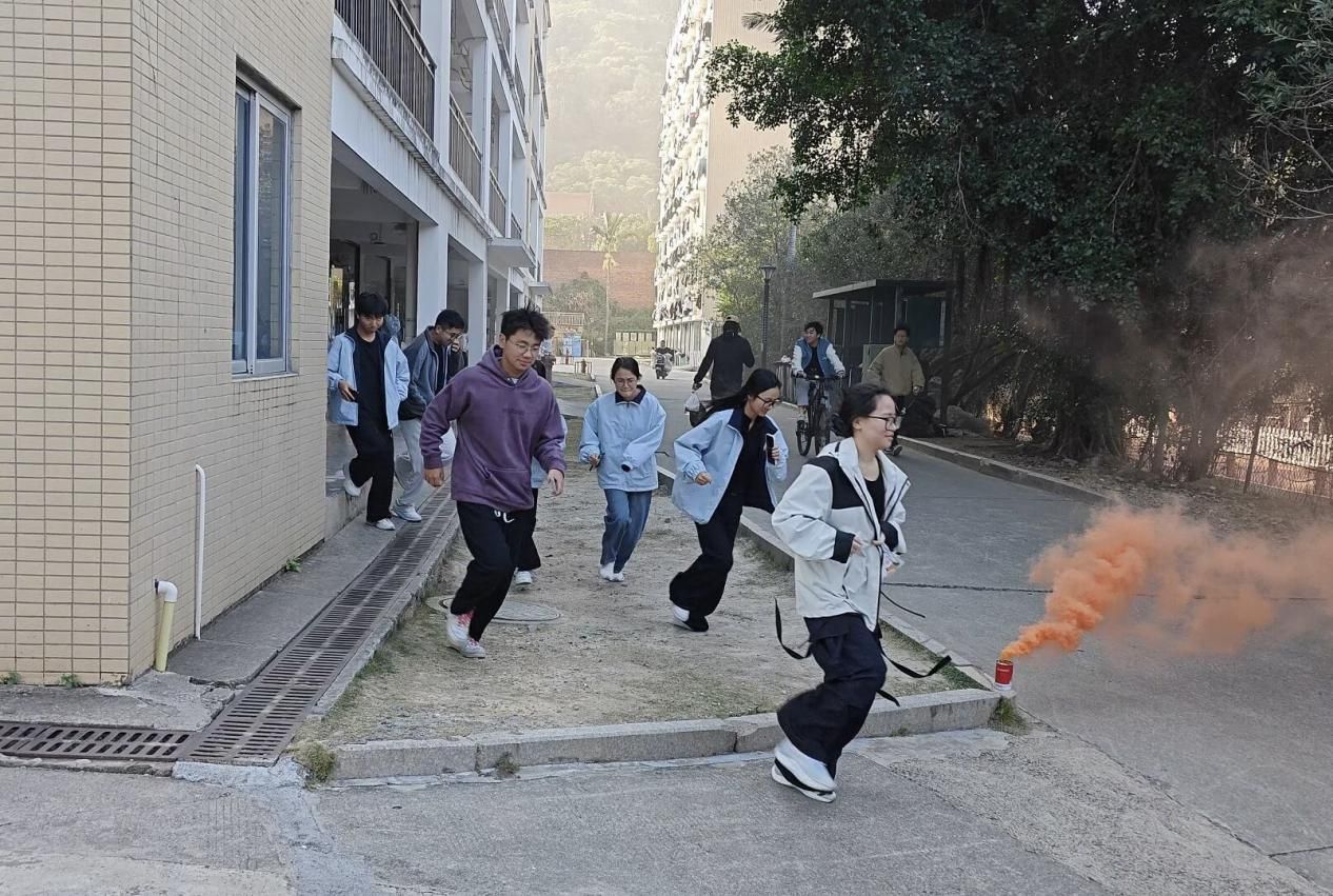 随着消防警报骤然响起,演练正式拉开序幕。各宿舍楼学生在辅导员和学生骨干的引导下,迅速反应、沉着应对,严格按照预定疏散路线,低姿弯腰、掩住口鼻,有序撤离至田径场指定安全区域。整个疏散过程组织严密、行动迅捷,充分展现了我院学生良好的安全素养与协作能力。