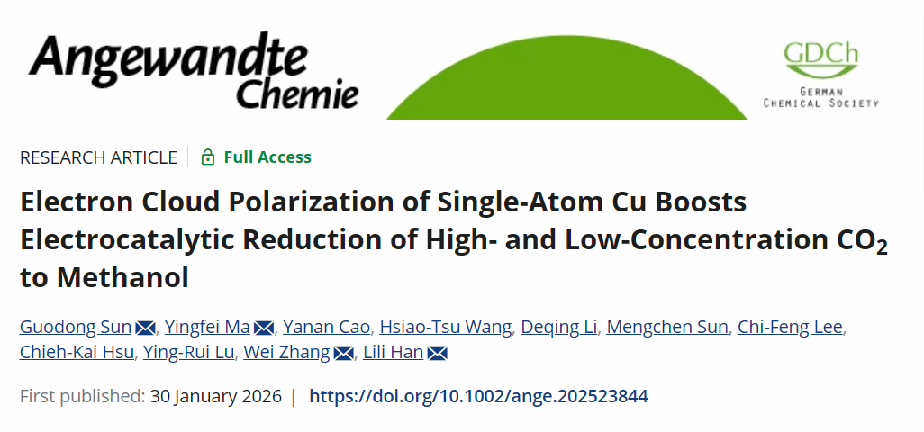 近日,我院在电催化CO2还原领域取得重要进展,相关研究成果发表在国际顶级期刊《德国应用化学》(Angewandte Chemie International Edition),论文题为“Electron Cloud Polarization of Single-Atom Cu Boosts Electrocatalytic Reduction of High- and Low-Concentration CO2 to Methanol”。福建技术师范学院为第一署名单位,孙国栋副教授为第一作者兼通讯作者,张伟教授、马颖菲副教授和中国科学院福建物质结构研究所韩丽丽研究员为共同通讯作者。这是我校首次以第一署名单位在《德国应用化学》上发表研究成果。