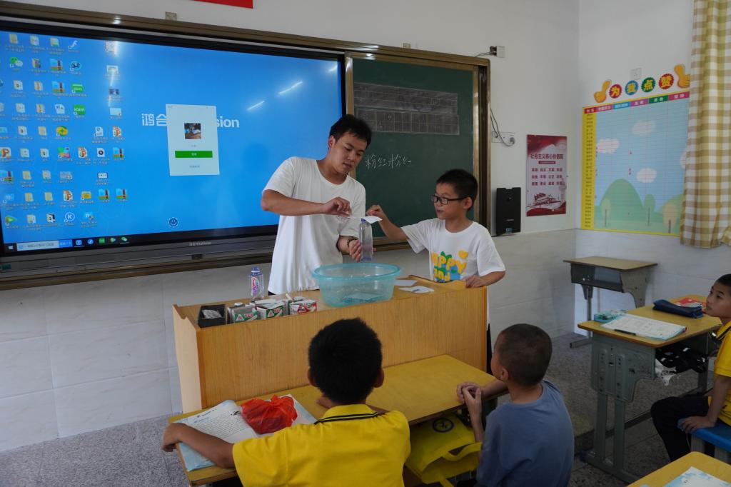 关爱留守儿童,播种爱与希望。顶着炎炎烈日,我院实践队来到溪尾乡中心小学开展“留守儿童关怀行动”。队员们给孩子们准备了自然科学、趣味实验、绘画创作和安全教育等四堂课,带来了许多零食和小礼品;孩子们通过亲身参与生动有趣的表演,在欢声笑语中接受了新知识。在开拓孩子们的视野、点燃孩子们的希望的同时,我们更期待他们在成长道路上永远拥有一颗爱人的心、感恩的心,积极向上,健康成长。