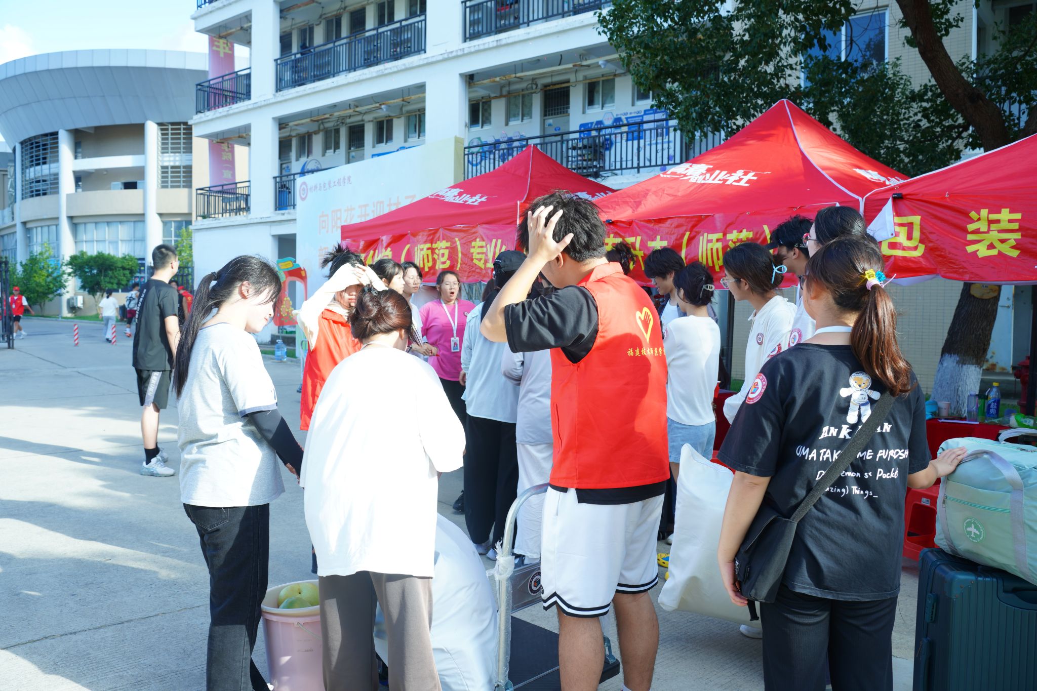 在日新园、向高园等新生报到现场,院党政领导、全体辅导员以及迎新学生团队热情迎接2023级莘莘学子的到来。尽管烈日当头,各专业学生干部、迎新志愿者用一张张亲切的笑脸、一句句暖心的问候来对待每一位新同学,引导他们办理报到手续、为他们搬运行李、悉心解答疑问,以家的温暖氛围欢迎2023级新同学。