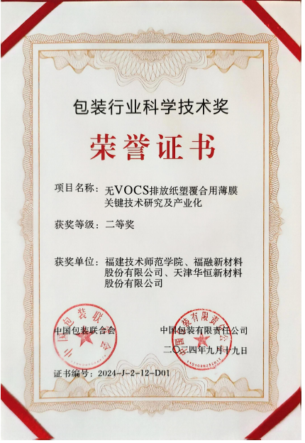 近日,中国包装联合会、中国包装有限责任公司发布2024年度包装行业科学技术奖评审结果,我院《无VOCS排放纸塑覆合用薄膜关键技术研究及产业化》项目荣获二等奖。