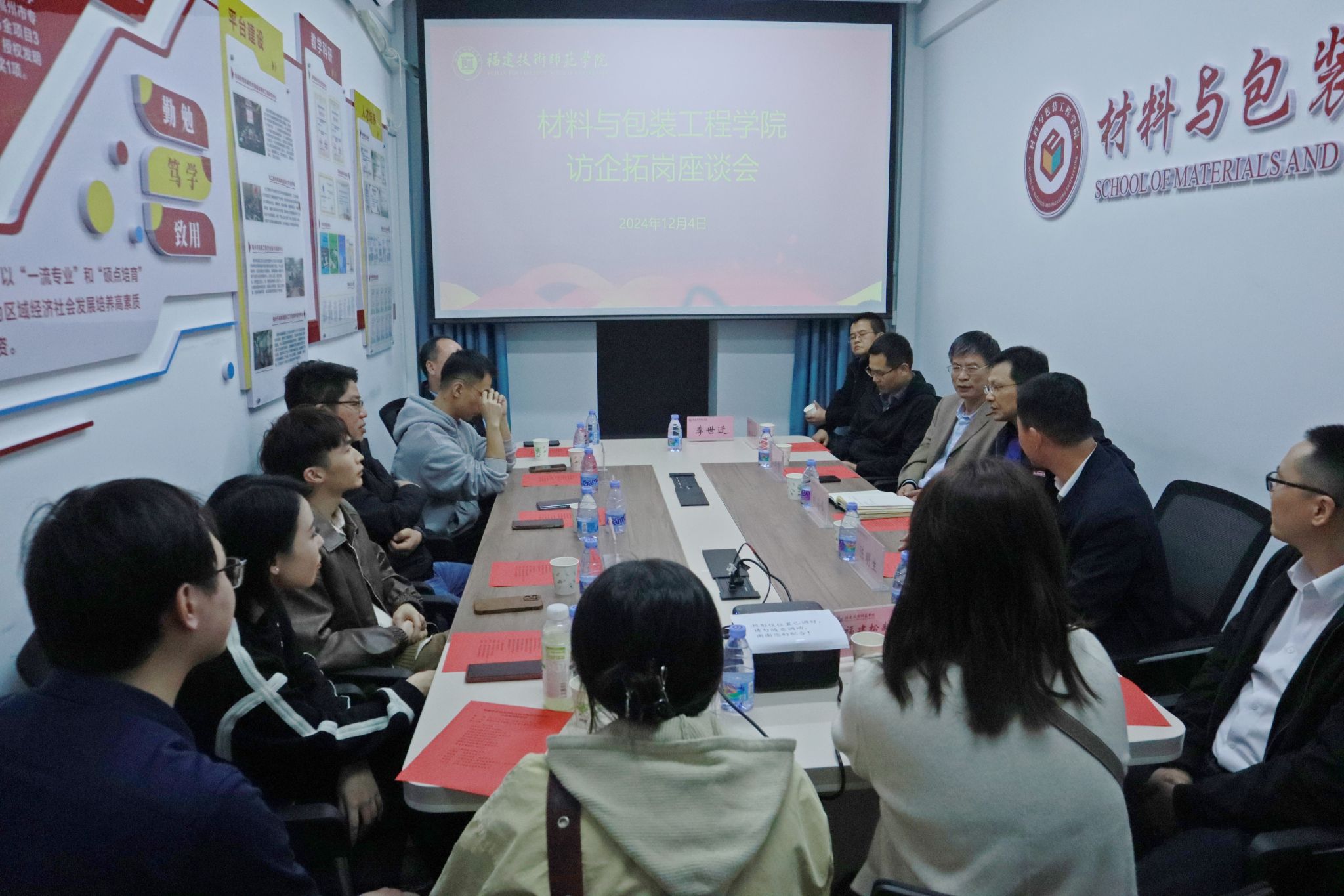 为深入贯彻落实党中央、国务院关于高校毕业生就业工作的决策部署,深入推进访企拓岗促就业专项行动,12月4日下午,我院在鹿鸣楼112召开访企拓岗促就业座谈会,福建龙净脱硫脱硝工程有限公司、福建恒杰塑业新材料科技有限公司、福建鑫瑞新材料科技有限公司、福州连宏检测技术有限公司、福建汉森新材料技术有限公司、福清旭泳塑胶有限公司、福建福松新材料科技有限公司、福清市心莘教育培训中心等8家企业受邀参加。校党委副书记林海峰出席座谈会并讲话,学院党政班子及毕业班辅导员参加会议。