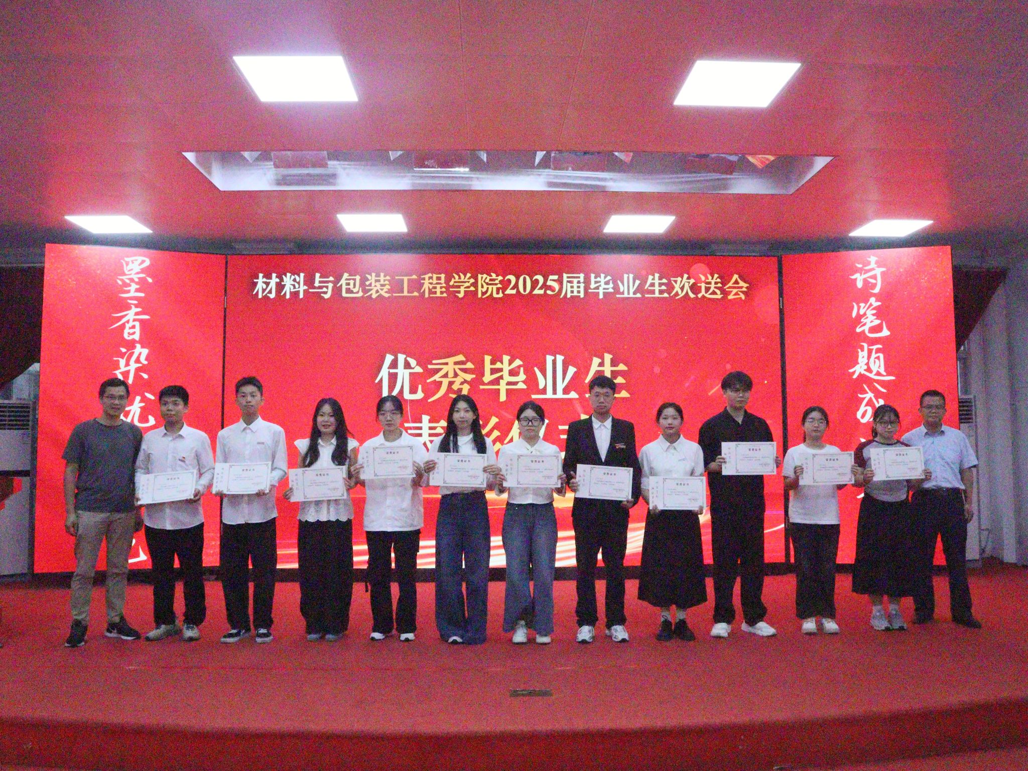 与会师生共同观看视频短片,重温2025届毕业生们在大学生活里的点点滴滴。随后,会上宣读了2025届优秀毕业生名单,学院党政领导及教师代表分别为他们颁发证书。毕业班学生代表梁燕榆,用真挚朴实的语言讲述了大学心路历程,表达了对学院的感谢、抒发了对同窗情谊的不舍。教师代表余美琼、苏羽航、方晨彦老师依次发言,对大家的顺利毕业表示祝贺,并鼓励同学们珍惜美好年华,积极追求梦想,不断挑战自我、超越自我,续写华丽的人生篇章。