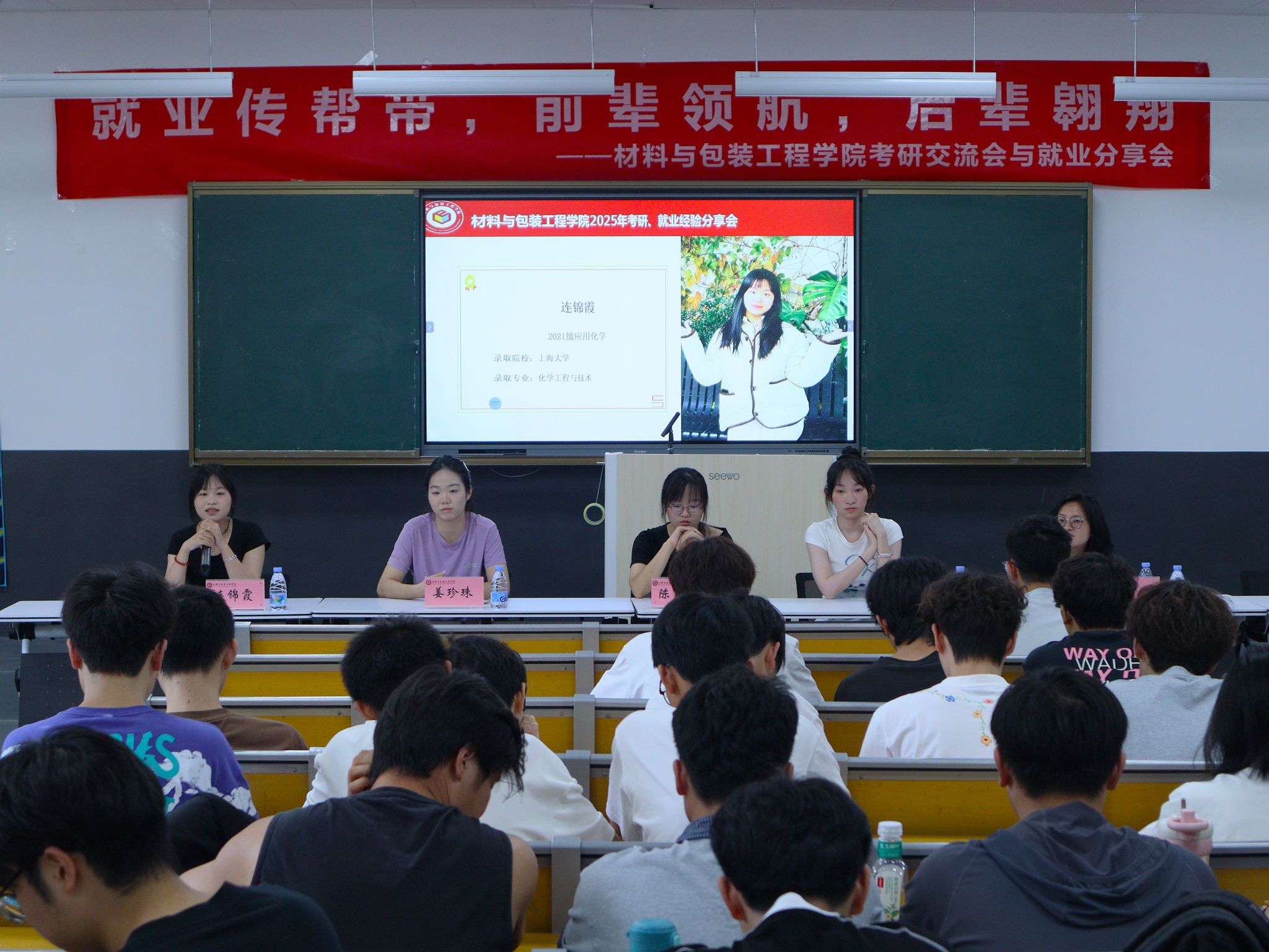 考研经验分享会上,2025届准研究生代表们结合自身奋斗经历,分享了考研与复试应对策略,从院校专业选择、复习计划制定、心态调整等方面,详细地介绍了备考秘籍。就业经验分享会上,在包装材料和包装设计领域工作的两位毕业生代表分享了简历制作、求职技巧以及职场心态等方面的实用建议,进一步拓宽同学们就业思路。同时,他们从用人单位角度出发,详细交流了岗位需求与职业发展规划,增进同学们对职场的认识与了解。互动交流环节中,同学们踊跃提问,现场气氛热烈。